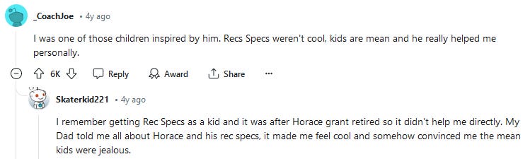Anyone whoâs worn Rec Specs knows how uncomfortable they can be. They hinder your peripheral vision, can fog up and it doesnât feel great when they get hit. Eventually, Grant had corrective eye surgery but continued wearing the goggles without the prescription lenses.