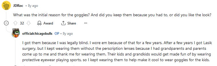 Several years ago, he shared during a Reddit AMA the reason he didnât drop goggles: